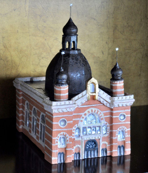 That sparked the idea to replicate her mother’s beloved and destroyed synagogue in clay, a medium she had been sculpting with for several years. In October she began her research, looking for pictures of the synagogue on the Internet. She was fortunate to find an article in the journal, Hungarian Architectural Digest, in which the Debrecen synagogue was featured. The article had the actual architectural drawings of the synagogue, and from that she was able to figure out a schematic to scale of the original building. She also found a newspaper article from 1897, describing the dedication of the synagogue.