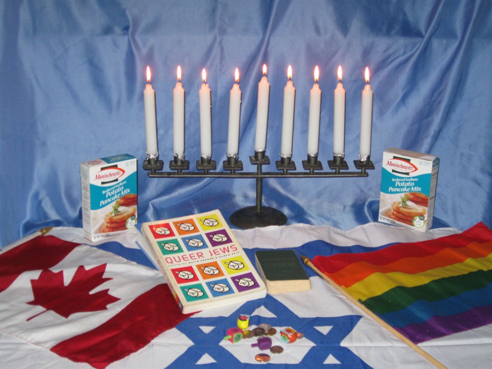 Our Pride float was symbolic of Jewish diversity, pride and inclusion, even under fire, and so is my menorah. In Nov. 2002, I was organizing a book launch and Chanukah party for Queer Jews in Toronto at Buddies in Bad Times Theatre, with dreidels sponsored by Israel’s Judaica, kosher catering with old-style latkes, sweet potato pancakes and sufganiot, cabaret singer and composer Harry Lewis on the piano with traditional Chanukah songs and his hilarious original tune, “Ch-Ch-Chanukah”, and readings by myself and my late academic colleague Oscar Wolfman. The place was packed, as the snow fell. My dear family was there, and we were photographed in NOW Magazine singing the blessings and “Maoz Tzur”, lighting the Chanukah lights on this same menorah. We got great press, sold lots of books, raised awareness, supported Israel, and had a great time.