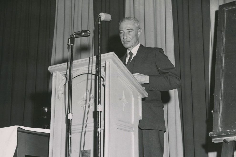 i. J.Robert Oppenheimer delivering a lecture at McMaster University in 1962. Courtesy of the William Ready Division of Archives and Research Collections, McMaster University