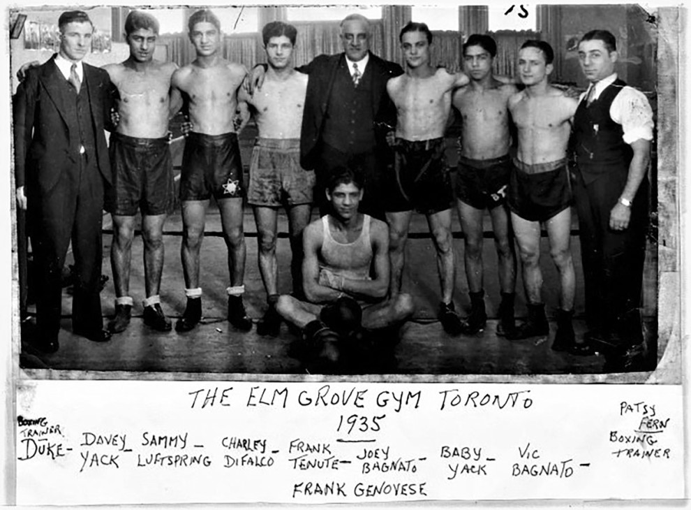 Look at the young men in the 1935 photo of the Elm Grove Gym. Arms around each other’s shoulders, Jewish and Italian boys who grew up and played together in the same downtown neighbourhood. Davey Yack, Sammy Luftspring and Frankie Genovese fought hard against each other as amateur and professional boxers. But two years before this photo was taken, on a hot August evening, they and the other aspiring boxers in the photo fought together against members of the Swastika Club and the Pit Gang in what is now known as the Christie Pits Riot. In the battle against antisemitism and xenophobia, the Jews and Italians found common cause.