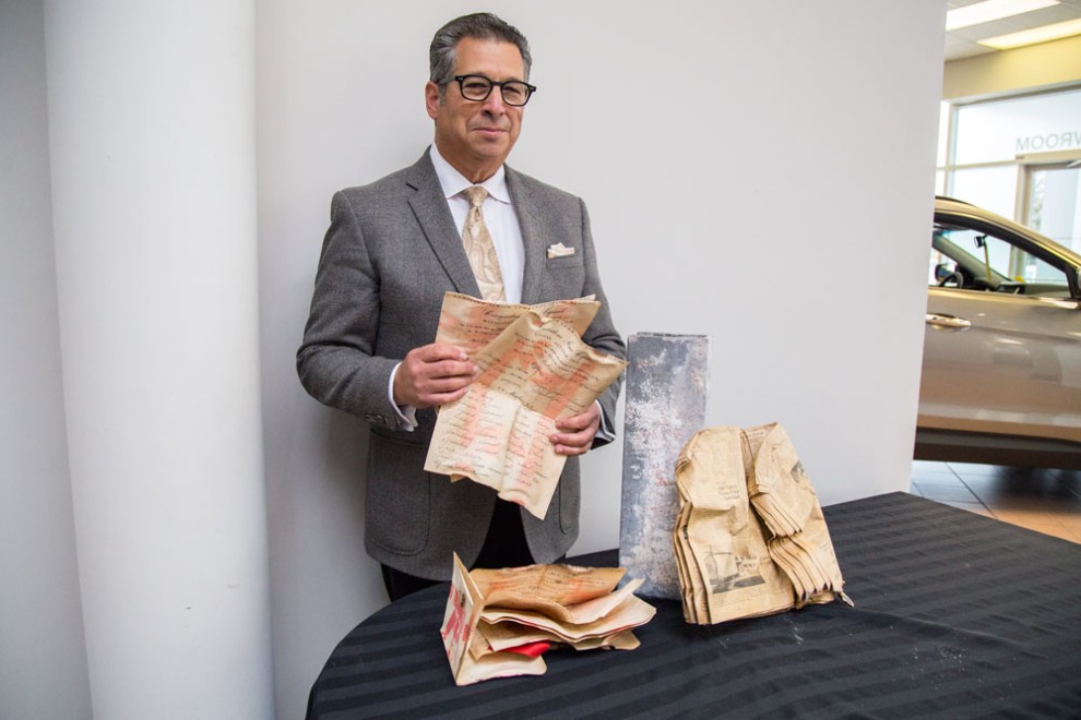My phone rings and it’s Lowell Richter on the other end. Would I like to join him in opening a time capsule that had turned up at the old Lower Lions Club Road JCC? Weeks later, I’m standing in an Eastgate Ford office, camera in hand, watching as Richter, dressed in an elegant business suit, unconcernedly reaches his arm deep into the dust-filled metal box and proceeds to withdraw one folded parchment after another and hold it up for examination and a photograph.