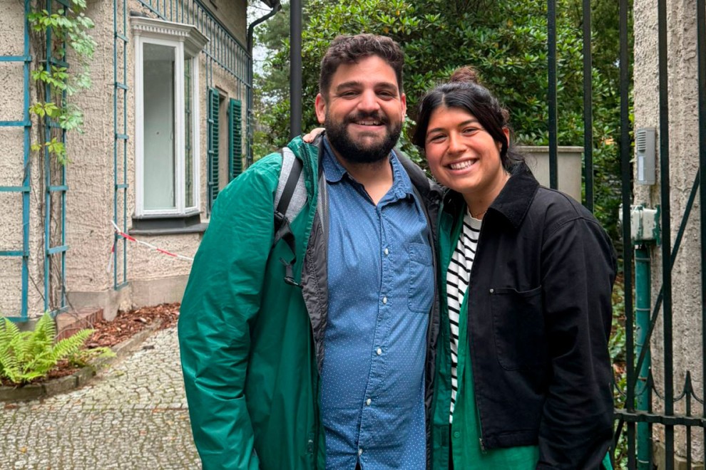 Caption: Jazmin Rymberg with Marc-Olivier Cloutier, manager of education initiatives at the Azrieli Foundation on the grounds of the House of the Wannsee Conference.